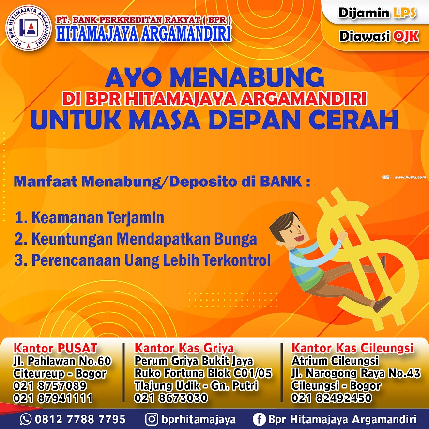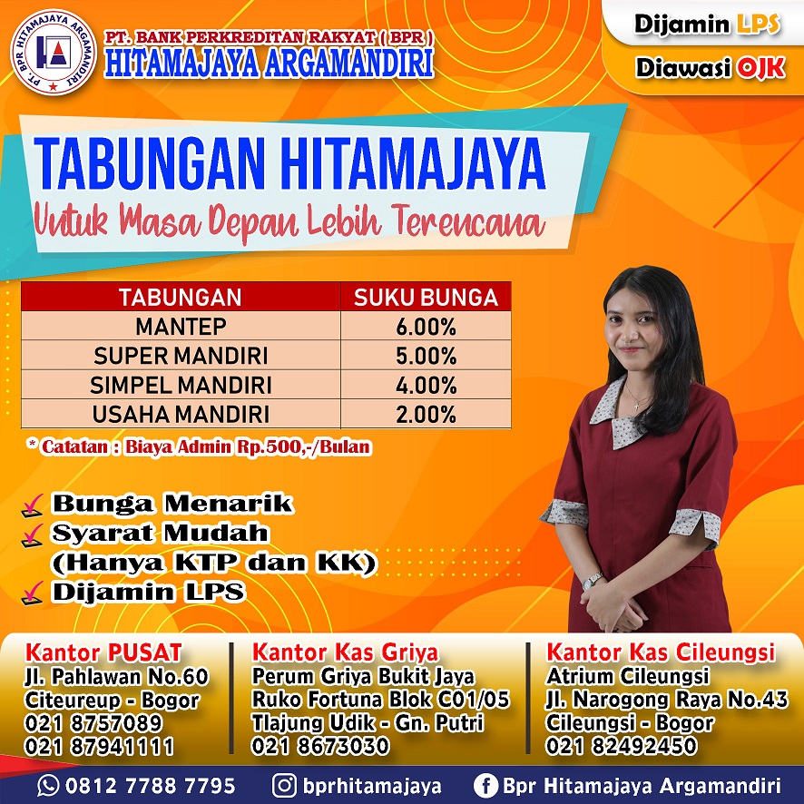 Simpanan uang di Bank yang penarikan dan setorannya dapat dilakukan setiap saat dan menurut syarat-syarat tertentu yang diatur oleh Bank. Tabungan Hitamajaya memberikan kemudahan bertransaksi dengan suku bunga tinggi. Suku Bunga ini merupakan imbalan jasa yang diberikan oleh Bank Hitamajaya atas sejumlah dana yang Nasabah simpan di Bank. Dapat dikatakan suku bunga ini merupakan hadiah yang diberikan Bank Hitamajaya kepada Nasabahnya. Ayo segera buka Tabungan Hitamajaya sekarang juga..